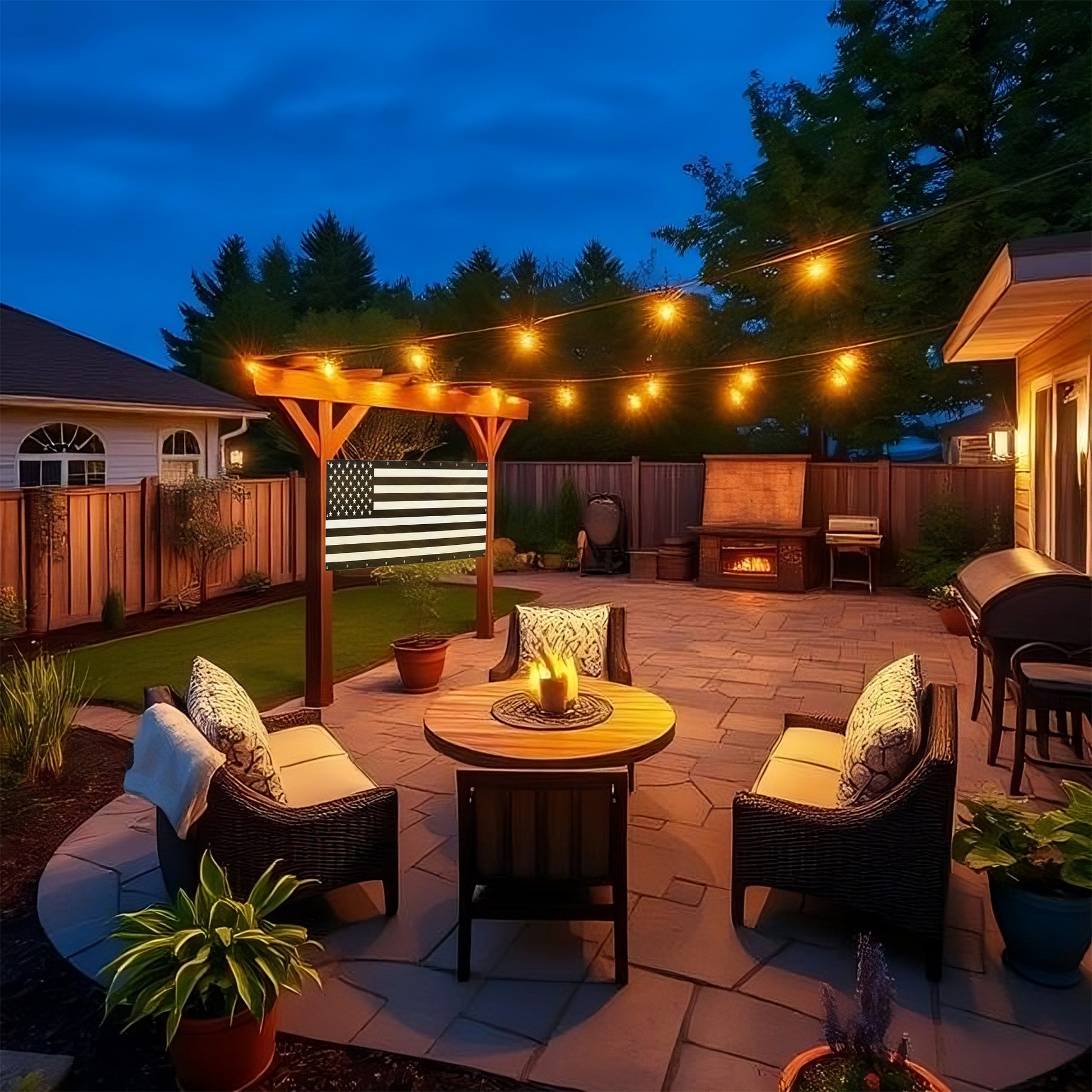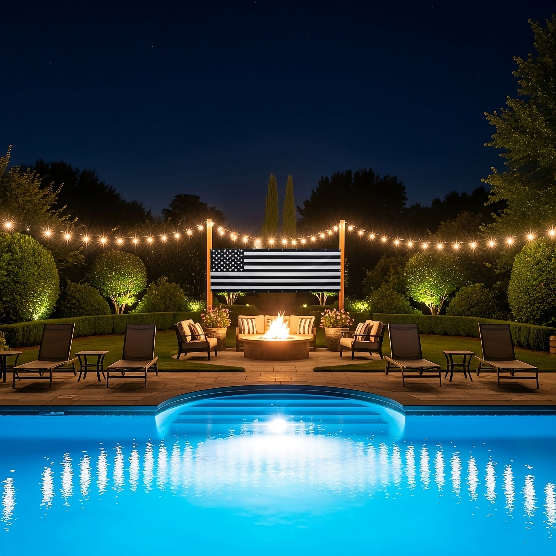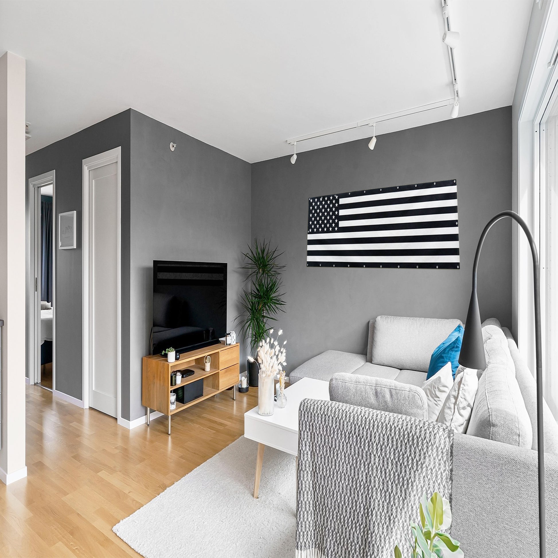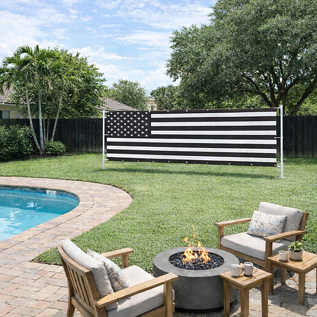 Show your patriotic spirit with this indoor-outdoor vinyl USA flag banner in striking black and white. Crafted from durable vinyl, it withstands various weather conditions, making it perfect for both indoor and outdoor display. The monochrome design offers a modern twist on the classic flag, adding a bold and sophisticated touch to any space. Ideal for events, celebrations, or everyday decor, this banner combines resilience with style to proudly showcase your American pride.
